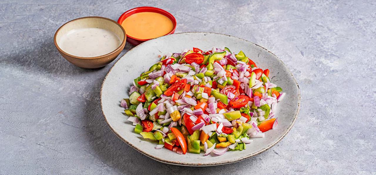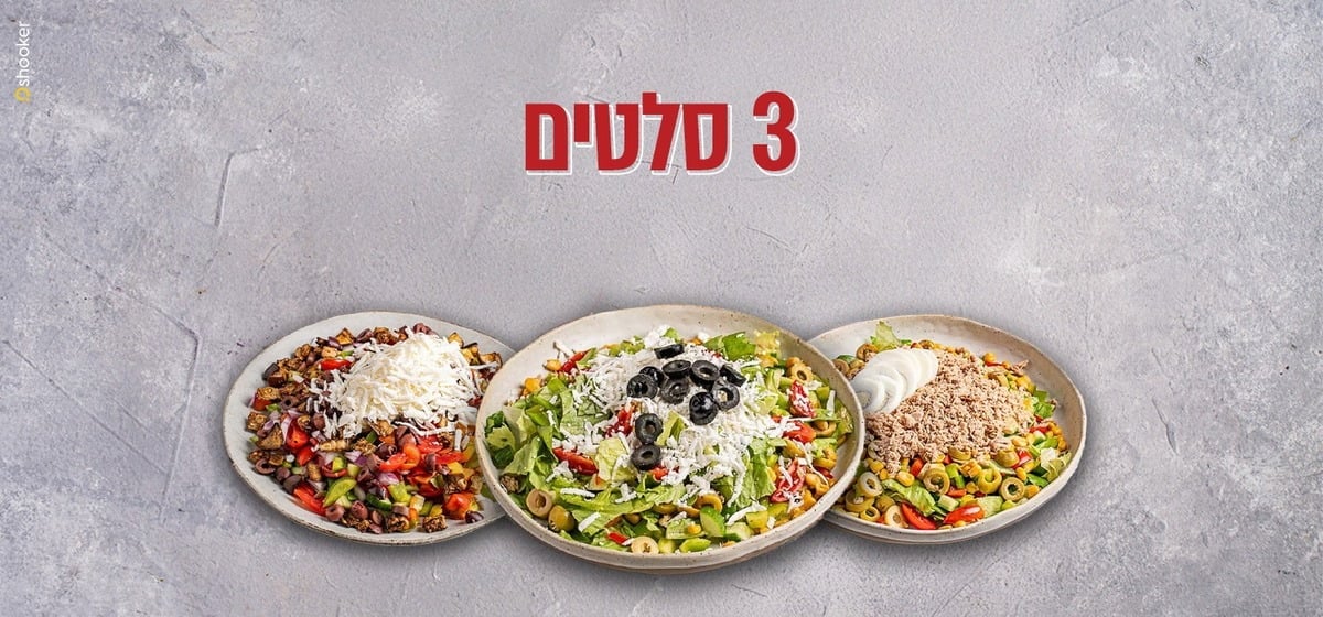בחירה מתוך ארבעה סוגי סלטים: סלט יווני / סלט ניסואז / סלט שוק רומא / סלט ישראלי