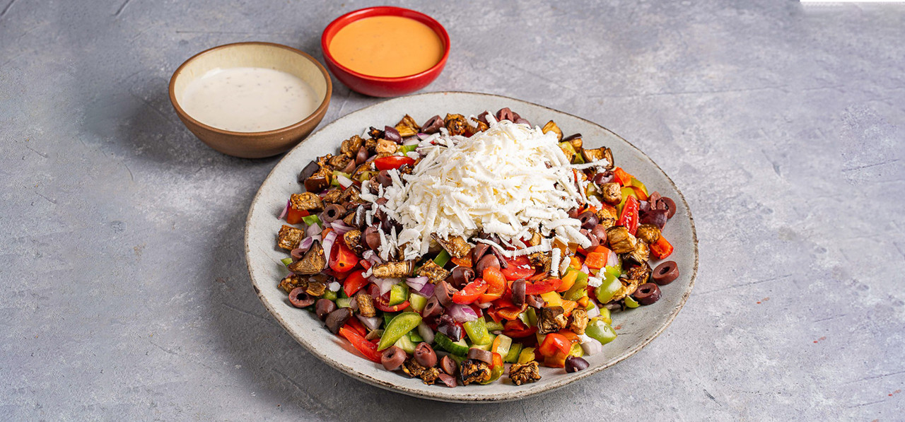 חסה, מלפפון,עגבניה,זיתי קלמטה,גמבה קלויה,חציל קלוי,בצל סגול,בולגרית