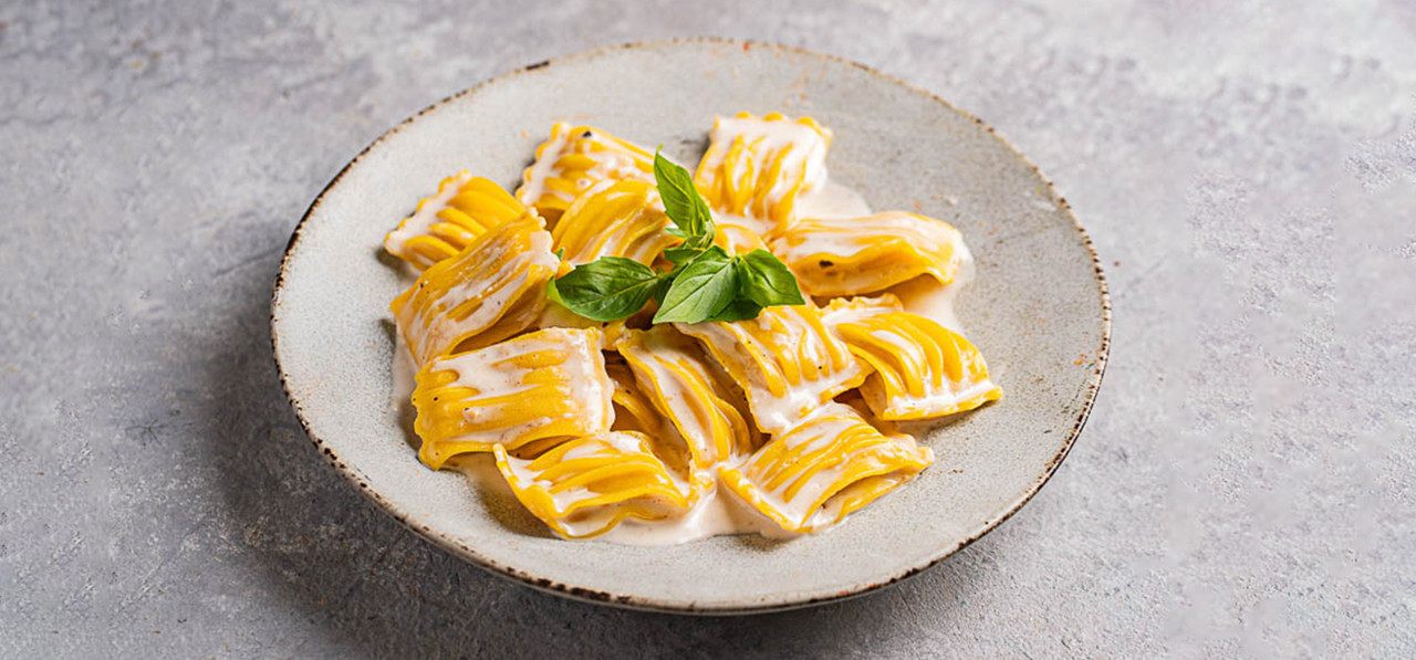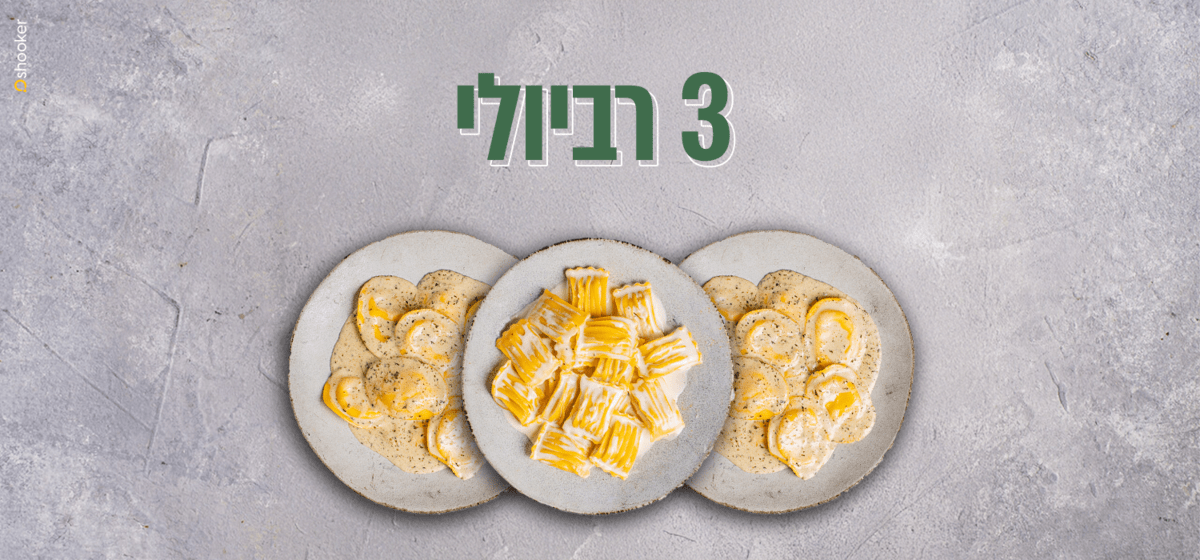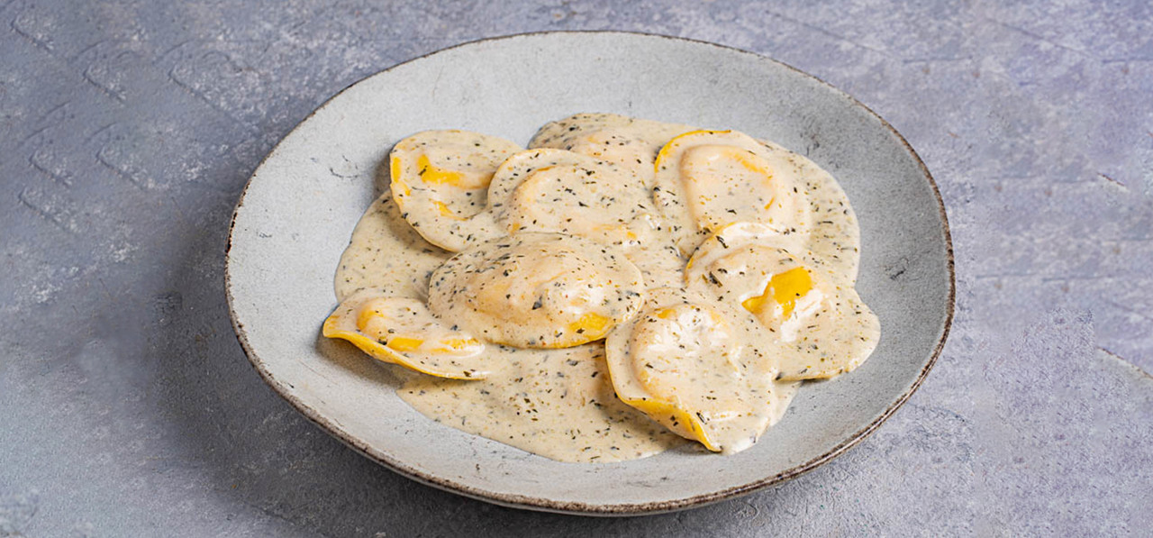 רביולי ממולא בגבינה איטלקית רכה, מוגש עם רוטב אלפרדו, 4 רטבים ותוספת לבחירה