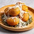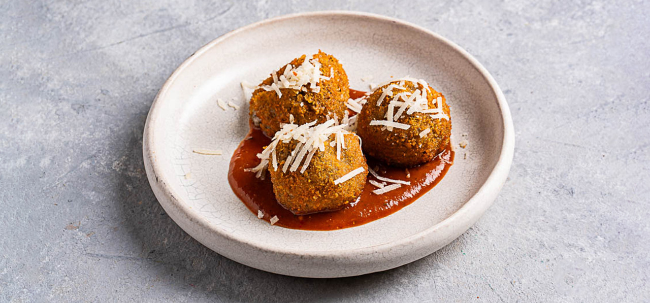 כדורי ארנצ’יני ממולאים בפטריות רכות, מצופים בפריך ומוגשים עם רוטב.